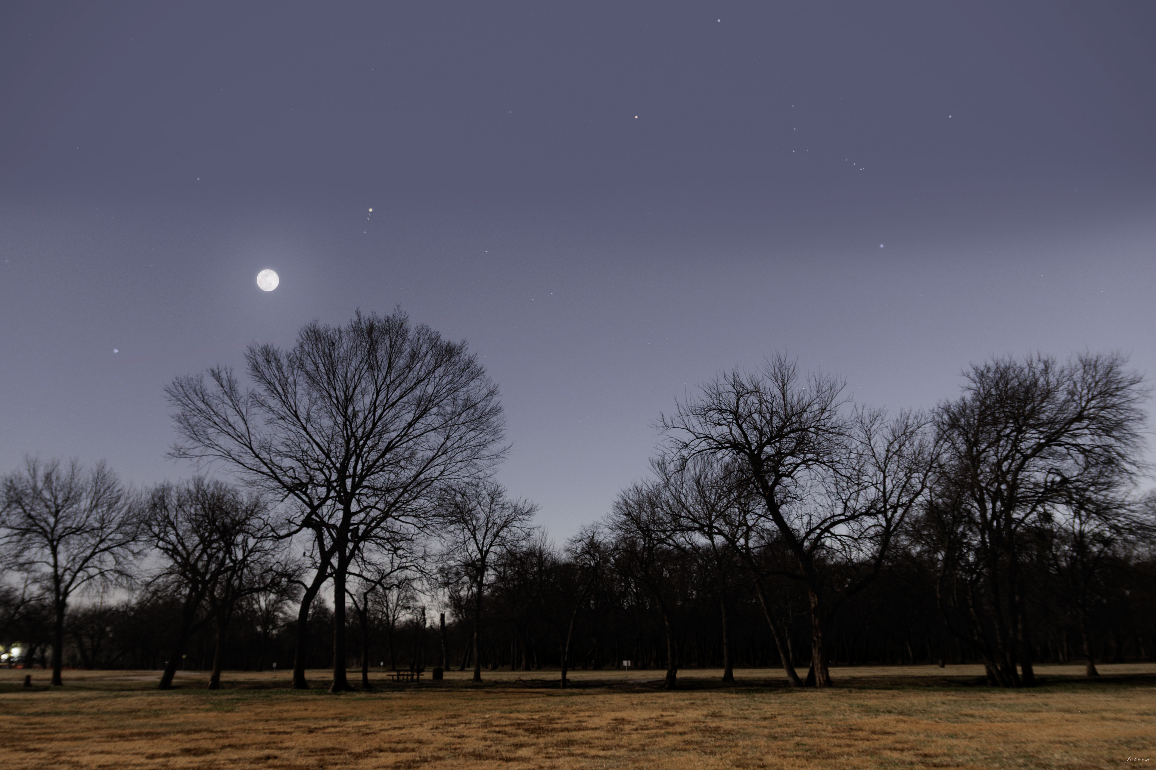 You can see the Orion constellation shining on the right, Jupiter glowing golden near the horizon on the left, and of course, the star of the show: our Moon.