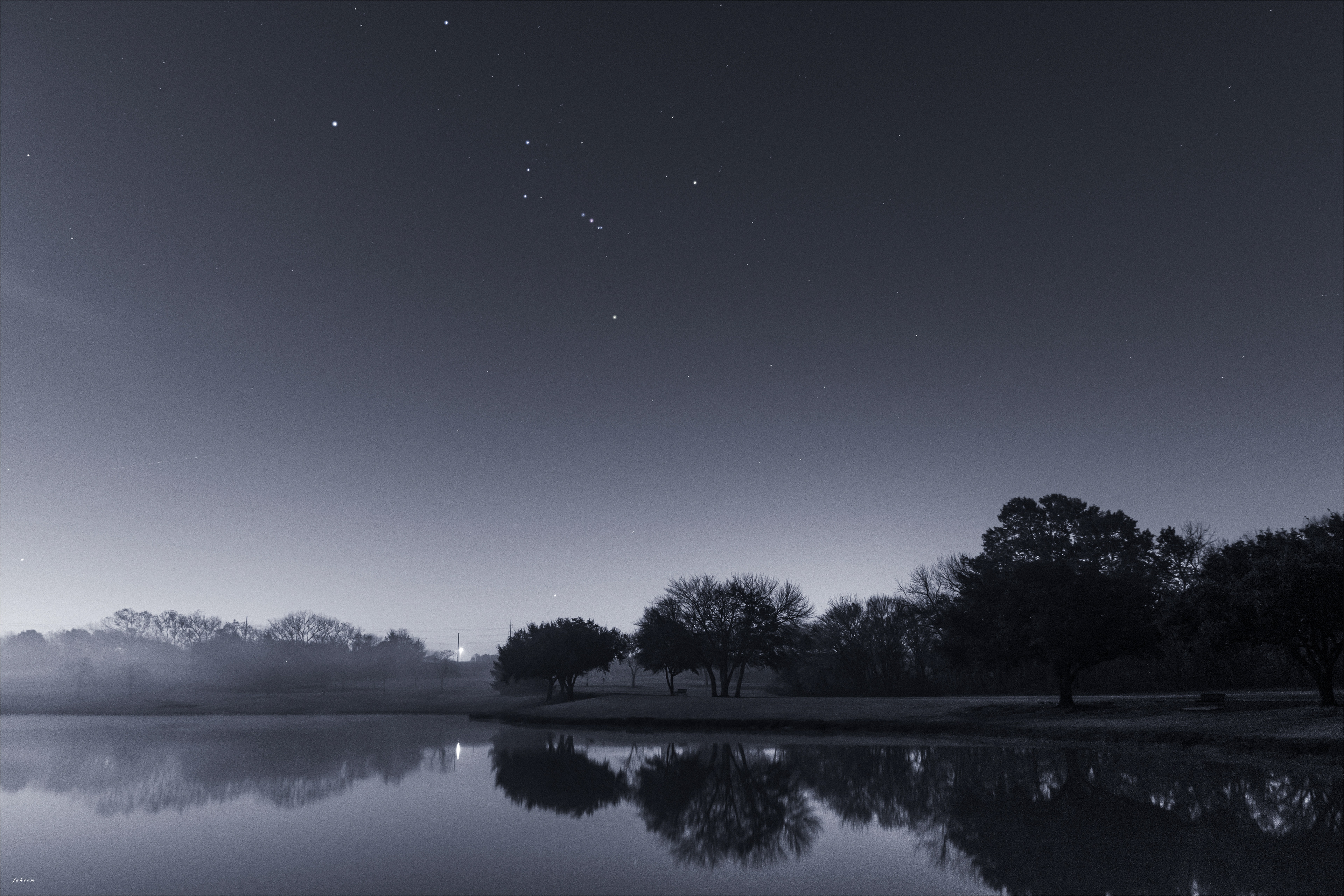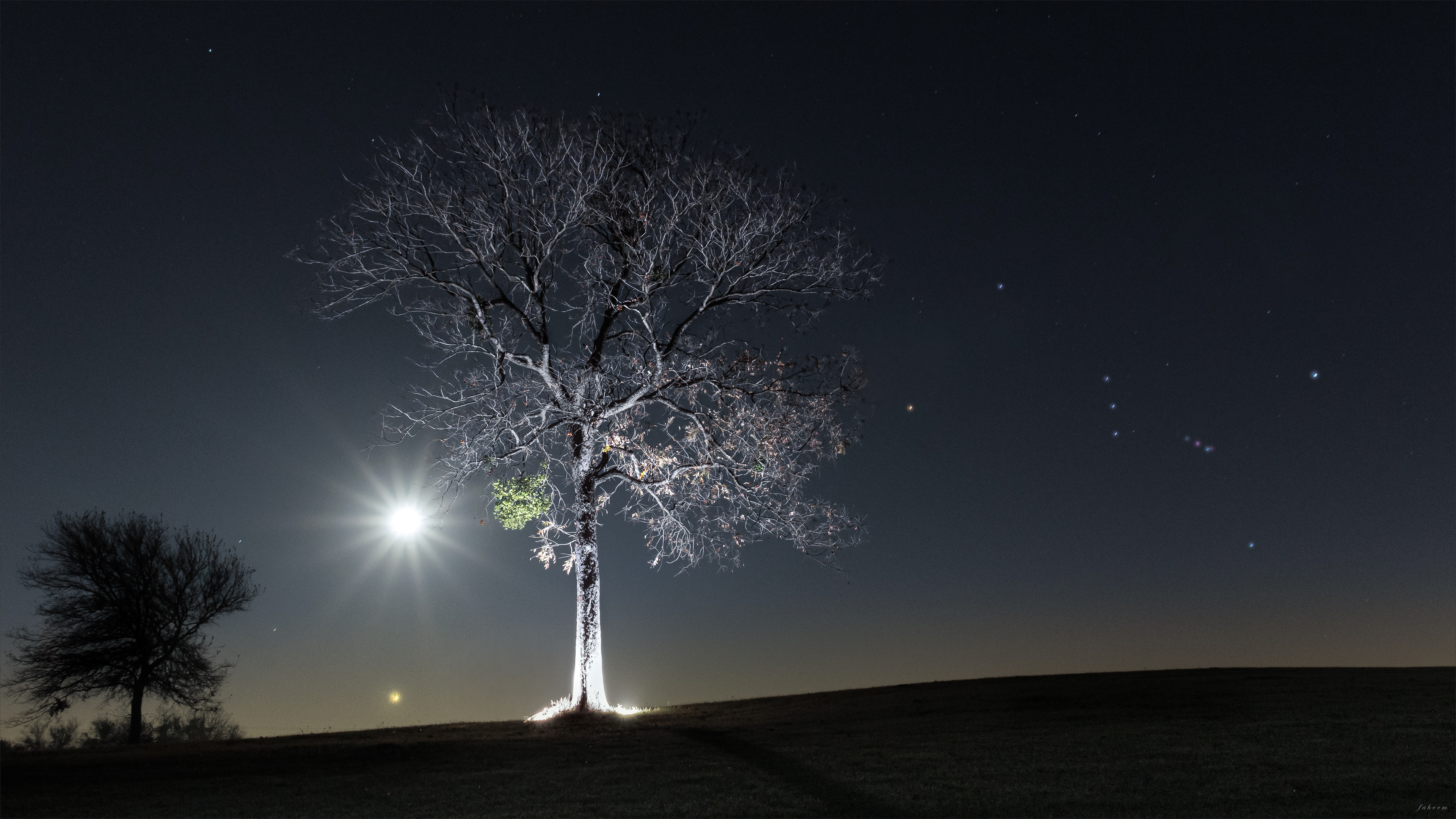 I photographed the sky elements separately—the Moon, stars, Jupiter, and Orion—and later stitched them together in Adobe Photoshop to preserve detail and visual balance across the scene.