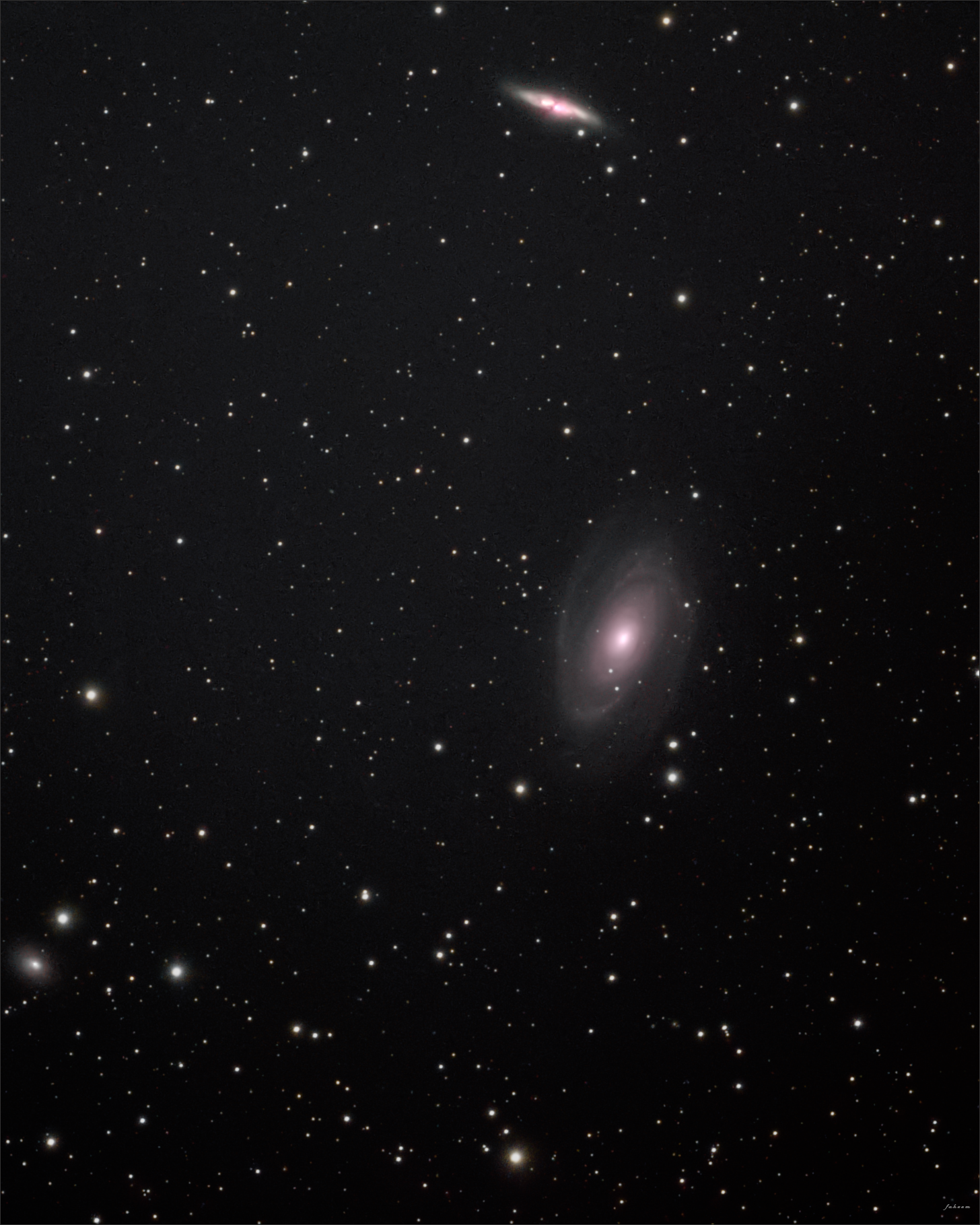 M81 (Bode’s Galaxy) and M82 (the Cigar Galaxy) first caught my attention while reading the Messier catalog. Later, exploring the northern sky in Safari Pro, I learned that this region includes several galaxies, like NGC 3077 (bottom-left), that are drifting away from the Milky Way — a reminder of how much of the universe we may never reach.